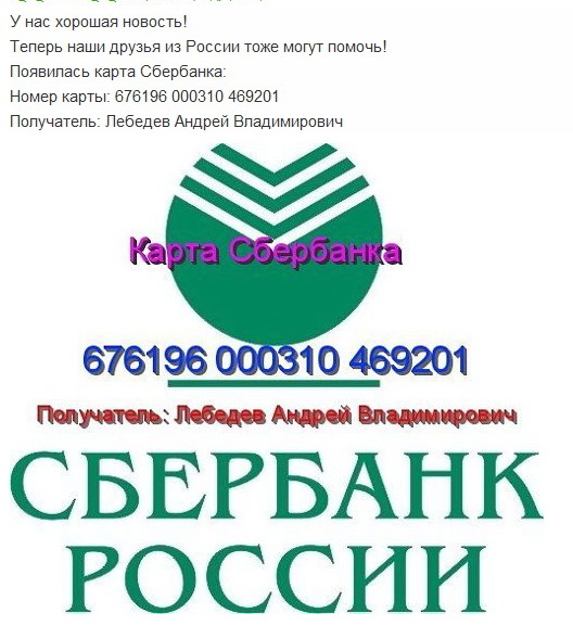 Назначение платежа: Сбор денежных средств на имя Сороки Владимира Михайловича для лечения дочери Анастасии Владимировны Сороки.
