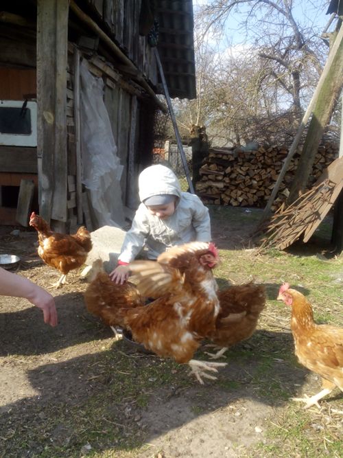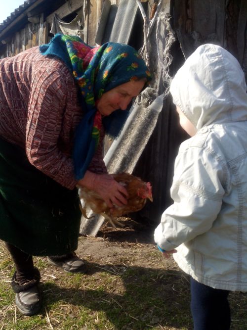 Прабабулечка познакомила правнучка с курочками.