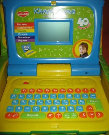 повторюсь тут)))) сначала у нас был простой, куда вставляются картинки, нажимаешь на нее и тебе название буквы или изображения. потом дрстался по наследству компьютер с диском. этот вообще не вызвал интереса.экраны черно-белые были и маленькие прямоугольные.планшет тоже валяется. только ноты слушает там. могу потом фотки приблизительные скинуть)) или самой забить в поисковик что нить типа "ноутбук с диском" он обязательно его выдаст. возможно, у нас отсутствие интереса связано в том, что дочь имеет доступ к настоящему ноутбуку и телефонам.