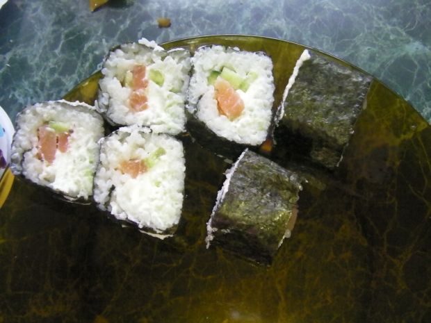 да дело не в декрете )))а пилять в моем мегаполисе)))давно листы нори лежат и куплен суши-рис--рыбу купить не проблема--а вот рис заправляется спец заправкой--но её можно зделть самому-ну так сцуко  яблочный уксус не найти  --заменила соком лимона--короче --у меня суши-импровизация---а на тусе можно даже замутить