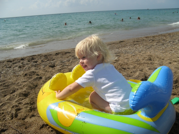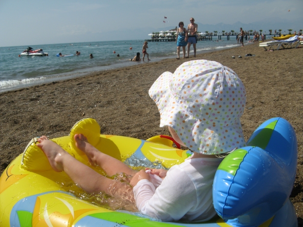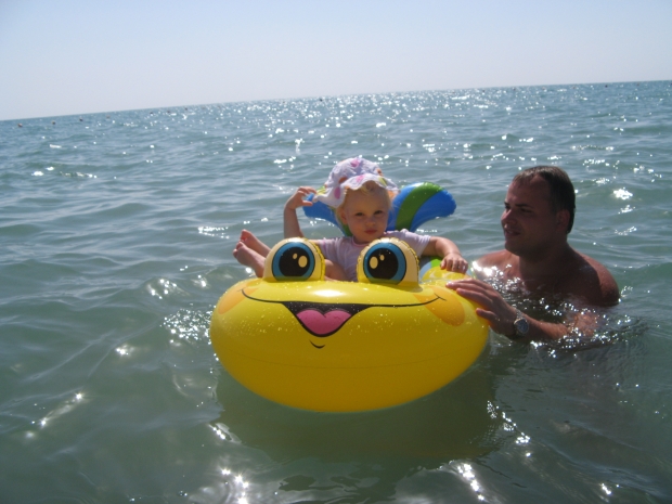 На фотографиях дочке больше, чем годик, но с первого отдыха на море функции этой штуковины не меняются. Круг на шею тоже возьмите, может пригодится. У нас плавание занимает незначительное время, а вот игры на берегу любимое занятие.