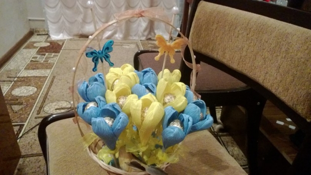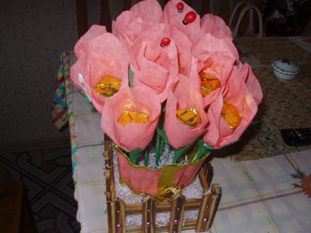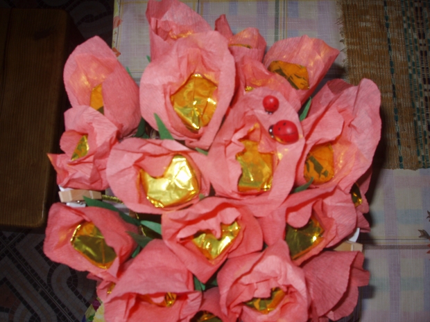 это я напутала, прошу простить) что-то у меня в голове все наоборот отложилось. Не, из креп бумаги букет делать пришлось, т.к. не нашла гофрированную. Но я надеюсь, что это был первый и последний раз, геммор еще тот. А так да, с гофрой работать одно удовольствие)