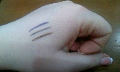 Я в восторге от этой троицы! Карандаши отличные!! Три цвета - коричневый, синий и черный. Цвета очень красивые, насыщенные, синий с легким черным отливом. На кожу ложатся ровно и мягко, очень стойкие - не размазываются и не отпечатываются в течении дня. Но в тоже время смываются обычной умывалкой для лица. Так же в карадашиках есть маленькая точилка, чтобы их подточить по мере необходимости. Гипоаллергенные и подходят для чувствительных глаз.