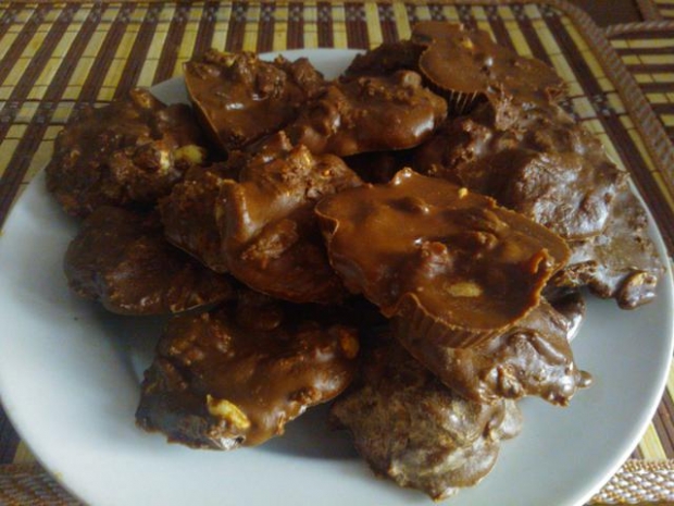 Еще добавила, как и по рецепту, ягоды годжи, немного изюма, кураги, смесь орехов. Так же добавила немного стевии со ароматом шоколада. Шоколадки получились вкусные и питательные, много не скушаешь. Вкус своеобразный, немного горчит. Но я большая сладкоежка и с чаем мне заходит "на ура"