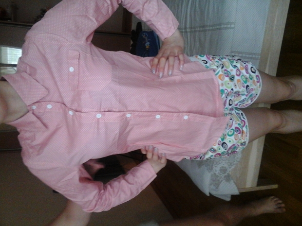 Размер 42 на небольшую грудь рост до 165. Бледно-розовая с бежевым горошком, очень милая, новая, мне не подошел размер. Хлопок 100%