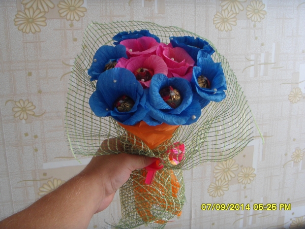 Сделаю на заказ корзины с конфетами,на любой праздник,конфеты и их количество можно самим выбрать,так же сделаю бутылки из конфет.Работы все мои ,но можете предложить что-то своё.