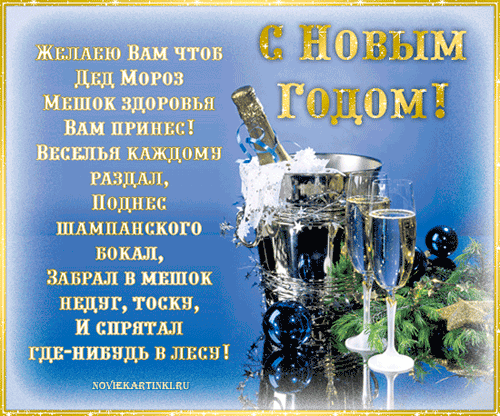 Желаю в наступающем новом году пить только дорогие напитки, ездить только на дорогих машинах, покорять без труда высокие и крутые горы, получать исключительно большие премии, слышать от знакомых только приятные известия и каждый день наступающего года встречать и провожать с хорошим настроением.