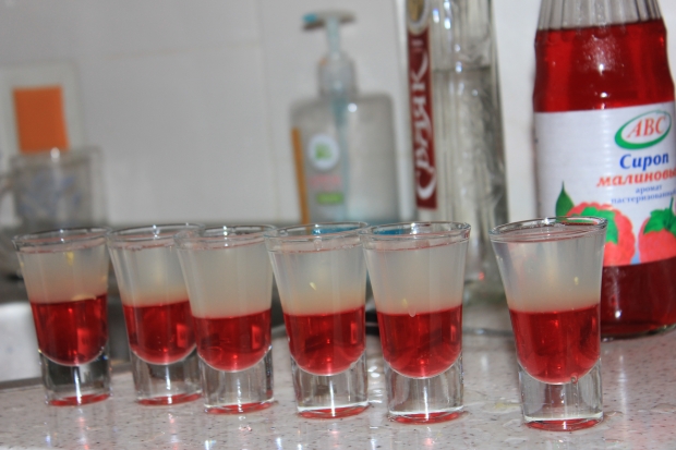 лимонного сока где-то 7мм наливать между водкой и сиропом