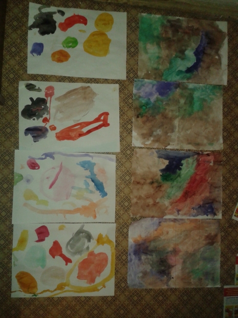 В последнее время Кирюша полюбил рисовать красками, Настя и раньше любила. Рисуем каждый день по 8-10 рисунков, причем у каждого своя техника рисования))) Вот, например, вчерашние рисунки: Настины слева, Кирюшины - справа.