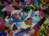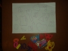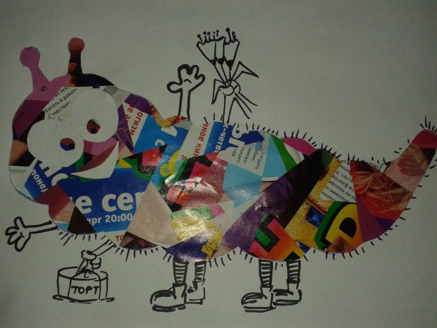 Делали разноцветную гусеницу: я вырезала треугольники из страниц журналов (детки в это время просто резали ножницами бумагу))), затем Настюша приклеивала их на бумагу, а я тем временем рисовала нашу гусеницу на другом листке бумаги, потом мы склеили 2 этих листка и вот, что у нас получилось..