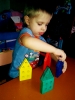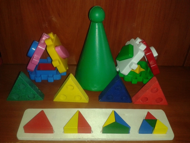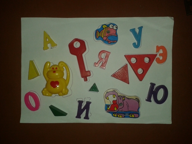 На "картинке с фигурами" у нас среди игрушек и букв спрятались треугольники разного размера. Я попрасила деток найти все треугольники и выложить их в ряд по величине; потом перемешала игрушки, буквы и треугольники и попросила разложить их на свои места. Детки сложили и разложили фигурки только один раз, т.к. особого интереса эта игра у них не вызвала.