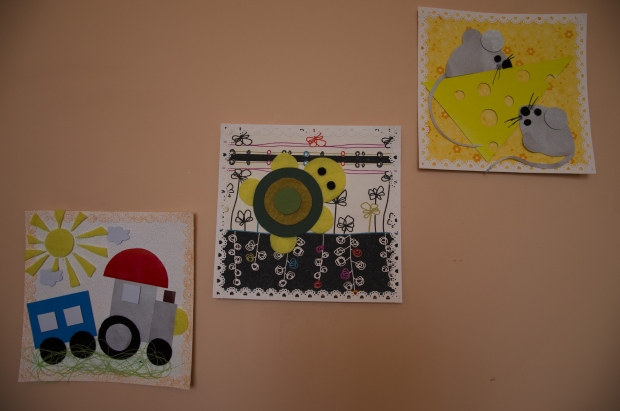 3. Сделала несколько картинок из геометрических фигур и повесила на стену. Оказались в наличии шторы с фигурами, поэтому их я тоже повесила.