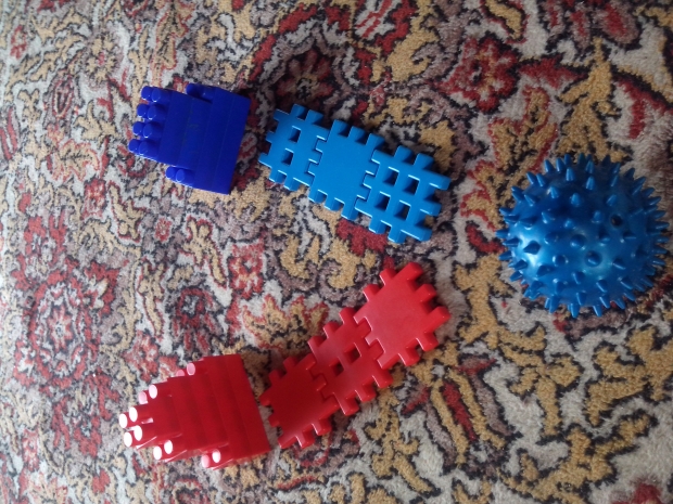 С конструктором мы играем следующим образом: мама строит башенки , а Арина рушит красную или синюю, как мама скажет, а ещё наша кукла Соня ходит по красной дорожке или синей к красному или синему домику соответственно.