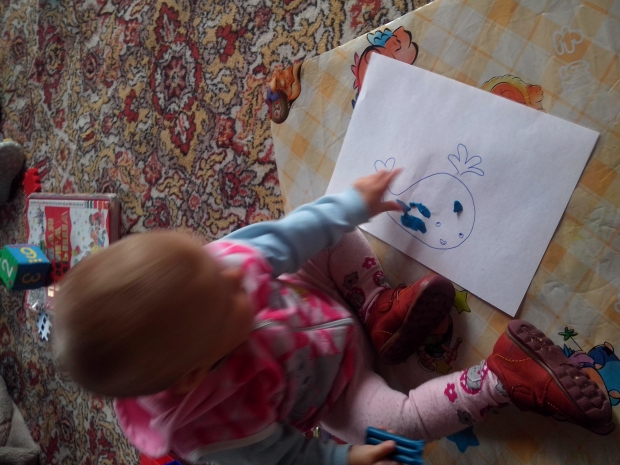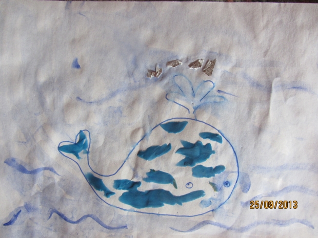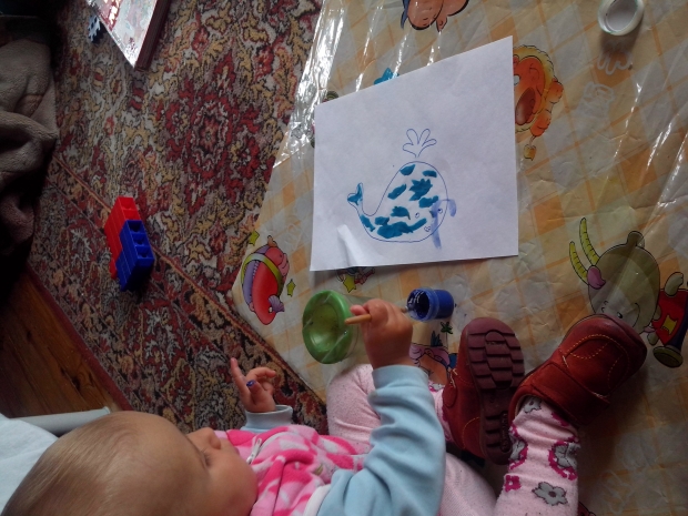 Рисование, пластилинография и полёт фантазии: Разводить воду и рисовать водичкой синего цвета Арине очень понравилось, затем на этом подсохшем листочке нарисовала мама кита, которого раскрасили пластилином, а в фонтан приклеили кусочки фольги (капельки).Сразу скажу что клеить что-то мелкое или крупы не для нас пока(тащит в рот, а что за творчество, если его мама отбирает:), одно расстройство :))