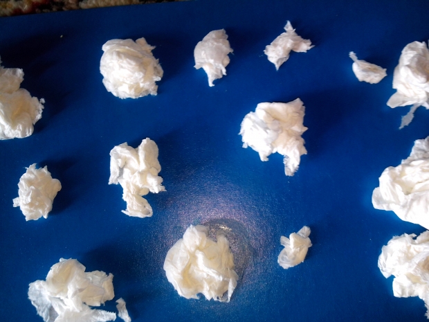 2.Творчество: Аппликация: Взяли синий картон, а на него скомкали и приклеили белые шарики(для кого-то снежинки ночью, кому-то водяные лилии...) На зелёной неделе сын предложил приклеить листочки и лягушку:)