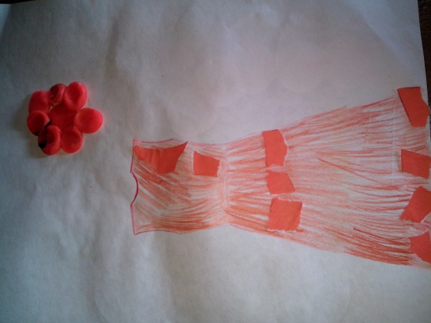 Слепили из красных шариков цветок. Поиграли в мазайку (детали выбрала естественно красные) А еще Аринка порвала на кусочки красную бумагу и украсила нарисованное платье.