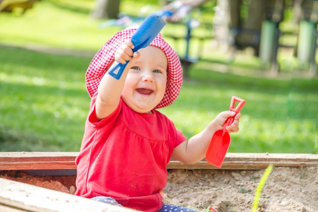 2.Идея сенсорной коробки хороша, но у нас она трансформировалась в кладоискание в песочнице: искали красные грабельки, красную лопатку, красные колечки от пирамидки и красные фигурки от геометрика.