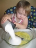 Вы можете сделать густую пальчиковую краску, просто увеличив дозу муки в составе, положить ее в мешок и показать дочке, как ее выдавливать. Думаю, что ей очень понравится рисовать узоры, тем более, что можно менять насадки.