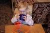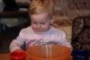 Учились сортировать предметы красного и синего цвета. В емкость насыпала гречку и спрятала детали двух цветов. Задача была, найти и перепрятать положить красные детали в красный стаканчик, синие -в синий. Не всегда получалось все правильно, но если Алеся правильно сортировала (было даже такое пару раз), то я ей хлопала. В итоге, теперь Алеся, когда играем, почти каждое свое действие сопровождает хлопаньем