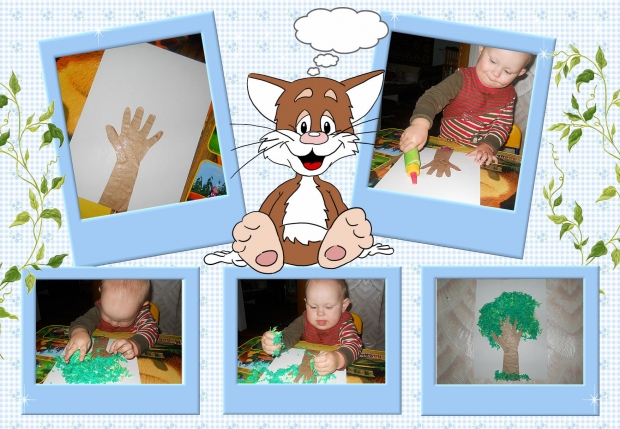 А сегодня мы с малышом делали аппликацию "Дерево". Для начала нашли зеленые ниточки. Пока я их резала, сыночек ходил вокруг меня и всё заглядывал в баночку, удивлялся как из длинных ниток получаются такие маленькие штучки. Трогал их своими ручками. Ему очень понравилось, что они такие мягкие. Затем мы делали ствол. С этим, как ни странно, пришлось повозиться. Просто у меня такой непоседа, что удержать его на месте только для того, чтобы обвести его ручку, практичеки нереально. Но мы и здесь добились успеха. Потом я приклеина основание нашего дерева на картон, и уже сам Богдан мазал клеем лист и сыпал на него ниточки. Правда и тут пришлось поработать, так как он хотел приклееные ниточки забрать обратно