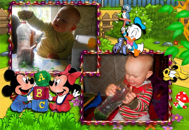 Одним из наших занятий стало создание волшебной бутылки. Я нарезала зеленый пластик, а потом уже сам Богдаша засыпал его в бутылку и заливал водой. Он вобще любит переливать воду из одной емкости в другую. А потом мы вместе рассматривали как красиво кружатся и танцуют зелененькие штучки в воде. Даже музыку включали и Богдан танцевал с бутылкой в руках. А потом еще долго сидел и переворачивал ее.