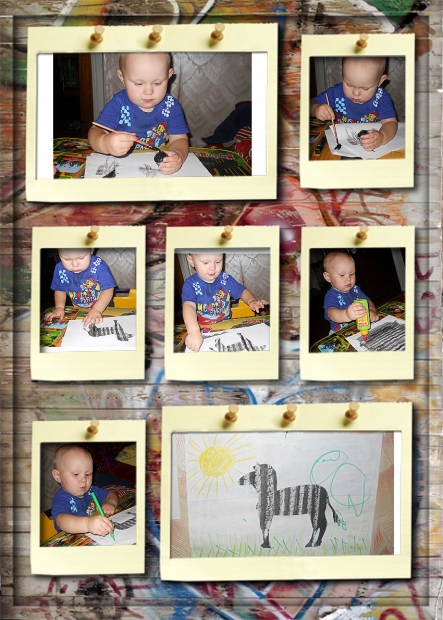 А потом мы делали зебру. Пока Богдан с бабушкой гуляли на улице, я успела подготовиться к творчеству. Налинеила воском один листик и вырезала зебру на другом. Сынишка с удовольствием мазюкал черной краской по белому листу. А когда я ему предложила приложить трафарет с зеброй, то он был очень удивлен, что у него получилась такая интересная лошадка. Минут 10 он прикладывал и убирал листик, при этом всё время восхищаясь этим изменениям. Наигравшись, он согласился приклеить трафарет. Затем мы дорисовали травку (чтобы было что покушать нашей зебре) и солнышко. А потом новая картинка по праву заняла место в нашей галерее на стене