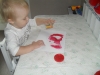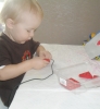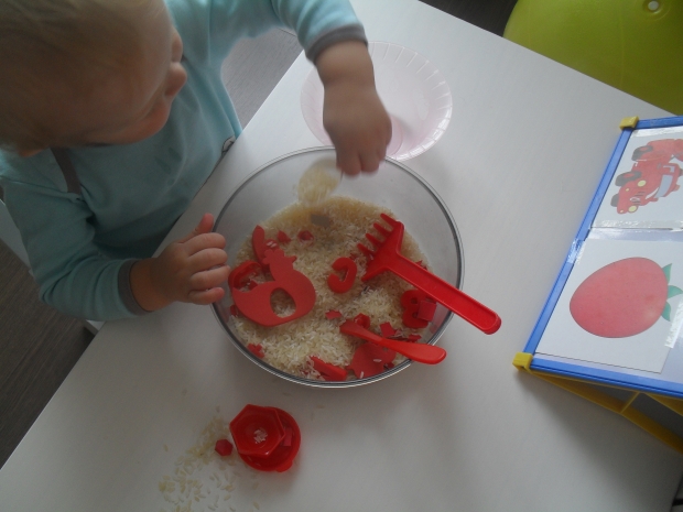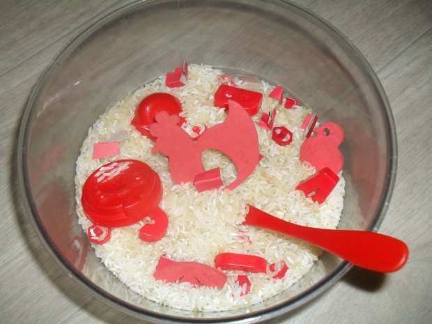 Также в 1-й день знакомства с красным цветом мы играли с сенсомоторной коробочкой. Наполнитель - рисовая крупа. Артефактами стали красные фишки, красные грабельки, красные буквы,красные кусочки бумаги,красные крышечки, вкладыши курочка и цыпленок красного цвета. Ребенку было предложено задание накормить курочку с цыпленком рисовыми крупинками, а для этого надо оставить в мисочке только рис, а предметы красного цвета, которые по ошибке попали в рис, переложить в другую тарелку. Ромка с удовольствием собирал красные предметы руками, ложкой, разгребал рис красными грабельками.