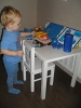 Наша доска знаний поменяла рисунки и теперь у сынули на столике красуются рисунки синего цвета. А еще рядом я поставила доску синего цвета для рисования мелками, в первый день по просьбе Ромки на ней поселился котик)