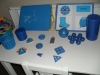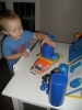 Учили мы синий цвет и при помощи одежды: дома одела сыночку синюю майку и синие колготочки, а на улицу пошли гулять в синей кофте и синей жилетке. Дома искали и рассматривали предметы синего цвета: посуду, игрушки и т.д. Игрушки синего цвета я разложила у Ромки на столике, а сыночек решил прокатить их на своей машине. Эта игра заняла его надолго! А потом мы читали стихи из синих книжек, рассматривали картинки синего цвета в книгах.