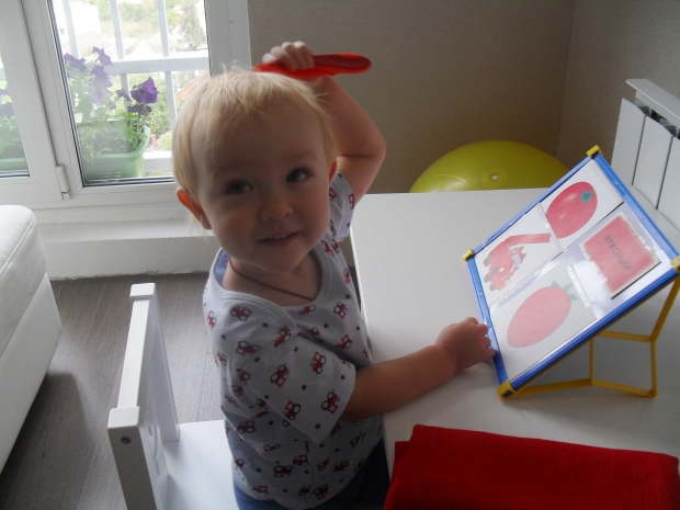 На протяжении всей красной недели, когда мы читали книги, я заостряла внимание сыночка на рисунках красного цвета. Мы также искали в квартире предметы красного цвета и выбирали красные игрушки.