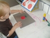 В тот же день мы рисовали красное яблоко. Губкой мы уже не раз рисовали, поэтому это творческое задание сынок тоже выполнял с удовольствием. Я вырезала разукрашенное яблоко и Ромка приклеил его на лист картона, а потом из кусочков пластилина мы еще сделали листики яблоку. Правда, сразу после этого задания сынок захотел кушать