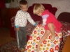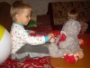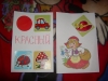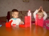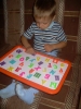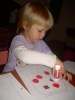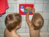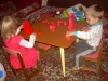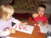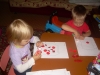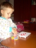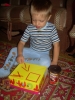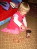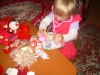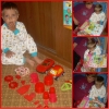 После дневного сна детки помогали мне делать красную упаковку для подарка на день рождения их любимой крестной. Называли красные предметы в коробочке. Настюша «кормила» Кирюшу красной вилочкой из красной тарелочки. Играли с мозаикой, выбирая красные элементы. Из красных палочек складывали квадрат и треугольник, засовывали палочки в баночку через отверстие в крышке. Искали красные буковки. Красной ленты дома нет, но нашлось 3 шнурка красного цвета (2 длинных и 1 короткий), вставила в крышку коробочки от чая. Кирюша вытягивал, я говорила ему длинный или короткий шнурок он вытянул, затем он открывал крышку, вытягивал шнурки обратно, засовывал их в коробку и закрывал ее, и так несколько раз. Потом он наматывал шнурки на ручки, а Настюшка помогала ему распутать. Настюша вытягивала шнурочки и, не открывая крышки, проталкивала их обратно, была увлечена этим занятием минут 15. После этого детки играли в догонялки, Кирюша тягал за собой эту коробочку, держась за длинный шнурок. Вечером чистили зубы, Настя сказала «Мама!!!!! Паста каасная» (у нас красная зубная паста), а Кирюша днем, смотря в окошко, увидел красную машину «Бибика каасная», т.е. стали обращать внимание не только на сам предмет, но и на его цвет. Перед сном, одев красную пижаму, Настюшка показывала красные предметы на рисунке над их диванчиками.
