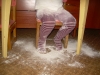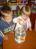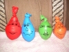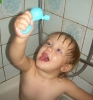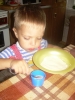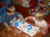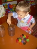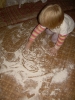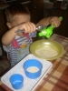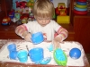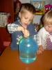 ). Затем мы делали сенсорные шарики: из разноцветных шариков мы выбрали только синие, наполнители - макарошки-звездочки, мука и крахмал. Мы одевали шарик на воронку и засыпали туда наш наполнитель. С макарошками шарик получился твердым, с мукой - мягким, а с крахмалом - пластичным и хрустящим. Малышам очень понравилось засыпать крахмал в шарик, поэтому мы наполнили не только синие, но и остальные шарики. Я нарисовала на некоторых рожицы (завтра прикреплю им волосики из ниток), остальные разрисовывали детки. Настюше и Кирюше понравилось размазывать по столу рассыпавшиеся муку и крахмал, поэтому я насыпала им муку на поднос, дала ложечки и синие стаканчики (Настюша даже пыталась сделать бабу из муки), Кирюша взял маленькую синюю машинку и возил ее по муке, оставляя следы от колесиков. Мука из подноса плавно "перекачивала" на стол, а потом и на пол, где малыши продолжили свое творчество. Чумазых и счастливых я отнесла их ванную купаться с синими игрушками, а сама убирала последствия наших заданий. В ванной Настюша поливала Кирюшу из синего стаканчика, детки складывали пазл-черепашку с синими элементами. В пару оставшихся синих шариков я набрала воды, малышам понравилось сжимать такие шарики в ладошке.