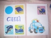 Nadin_85: Пока Настюшка была в садике, мы с Кирюшей подобрали картинки для синей странички книги и приклеили их. Сынуля отобрал предметы, книжки и игрушки синего цвета и аккуратно расставил их на диване (это лю...