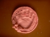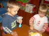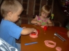 Лепили из красного пластилина: катали колбаски, колобков, отрезали стекой и отщипывали кусочки пластилина (как говорит Настюша "Нани нямни птипти" - Настя сделала еду для птичек). Больше всего деткам понравилось делать лепешки "Хлоп-хлоп ладошкой - получается лепешка!"