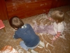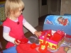 Потом детки отобрали красные игрушки и красную посудку. Мы лечили игрушки, кормили, укладывали спать, катали с "горки". Кирюша играл на красной игрушечной гитаре. Потом детки сами катались с "горки". Детки отобрали красный конструктор и сделали башни. Кирюша выбирал красные детальки мозаики.