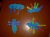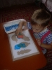 Пока я готовила завтрак, Кирюша играл с манкой, пересыпая ее в синие стаканчики. Сыночку очень понравилось вчерашняя затея с окрашиванием воды, сегодня он опять попросил "воду в банке", окрашивали ее разными цветами (заодно выучили 2 новых цвета - коричневый и фиолетовый). Я сделала трафарет тучки и тел стрекозы, ежика и рыбки, приклеила их на картон к столу скотчем. На красной неделе мы губкой не рисовали, решили попробовать на этой. Сынуле очень-очень понравилось так рисовать. Когда наши фигурки высохли, я их вырезала, мы отобрали синие прищепки и сделали стрекозе крылышки, а тучке - дождик. Потом Кирюшка прищеплял разноцветные элементы на ежика и рыбку. Сынулю очень увлекла игра со скотчем: он приклеил его к столу и раскачивал туда-сюда. Планировала сегодня сделать с Настюшкой и Кирюшкой аппликацию: Полет фантазии. Но мы весь вечер гуляли на улице.