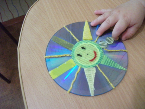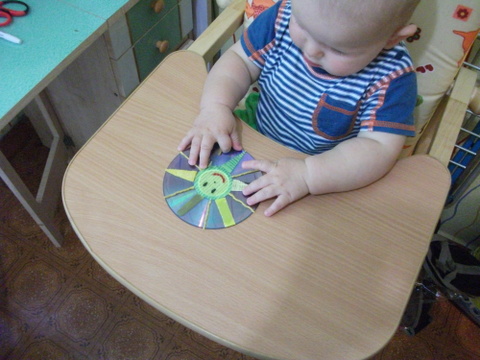 4.Познакомились с солнышком. Это в тему сенсорного панно. Солнышко получилось небольшое, зато очень разнофактурное. Тело солнышка из липучки от бигуди, а лучики это – пуговицы, флис, вафельная ткань, желтая клеенка, пластиковая ручка от ложки и ниточки пряжи. Все это наклеено на диск. Немного пощупали и пошли катать по полу )))