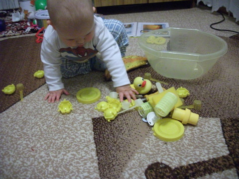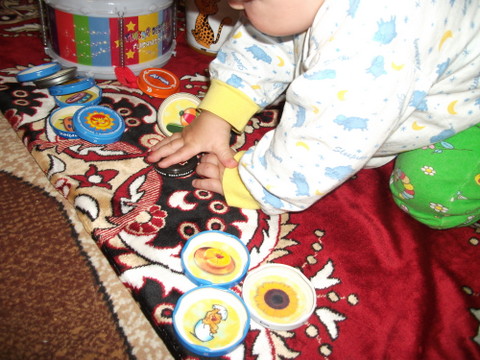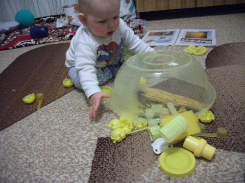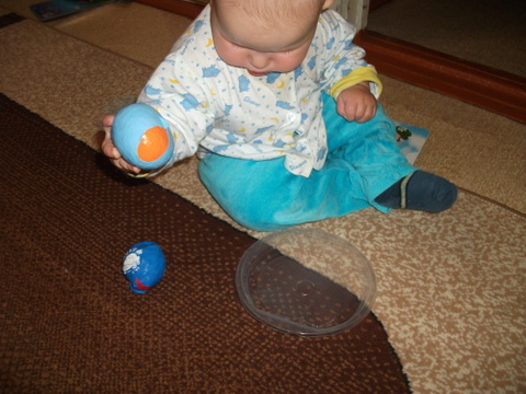 3. Сортер – интересная вещь. Ничего не поняли, но внимательно смотрели, что такое мама делает, а потом просто все перевернули и начали кататься на тарелочках )))