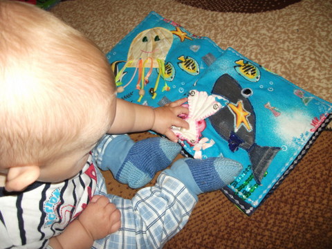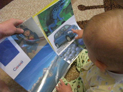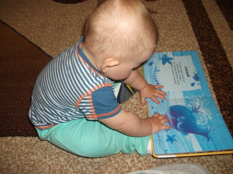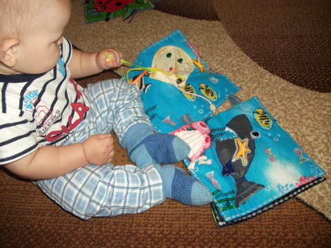 7. Ну и конечно же чтение книг. Рассматривали шитую книжку: синий разворот подводного мира с осминожкой и зубастой акулой. А также наша любимая книга-пазл имеет синие странички. Из всей книги это самый любимый разворот )))