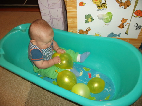 2. Сенсорные шарики нам знакомы и один даже был сделан – с рисом. Такой шарик очень похож на комок снега, приятно хрустит. В пару к нему сделали только шарик с фасолью. Пока силенок в ручках не хватает, чтобы хорошенько помять мячики, но периодически их замечаем и пробуем на вкус. Поэтому ложу крупу сразу в два шарика, на фото видно. В планах сделать с мукой.