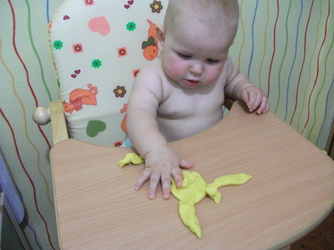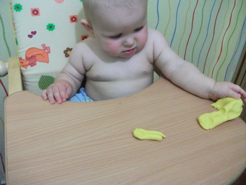 1. Сегодня познакомились с соленым тестом собственного приготовления. Масса получилась приятной. Деть немного помял для приличия, и начал тянуть все в рот. Его даже не смутило что тесто то соленое ))) Думала попробует и не будет в рот совать, ан нет, поплюется и по-новой ))) Так что закончилось наше творчество быстро, пока всю массу не слопал))