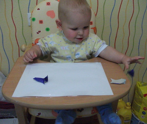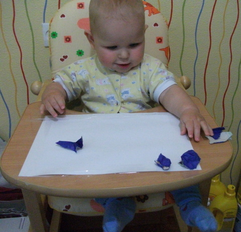 6. Аппликация нам далась только в самом начале, когда нужно нарвать и помять маленькие кусочки бумаги василькового цвета. Это сделали с удовольствием. А вот с клеем дело уже не пошло. Зато понравилось скидывать все «цветочки» со стола. Так что аппликация скорее получилась на полу, так сказать после творческого полета ))))