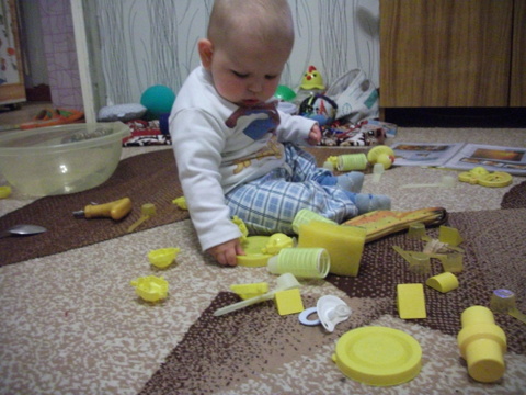 2. Затем собрали все предметы желтого цвета, какие нашли дома. Как всегда их не много. Пока мама доставала фотоаппарат перевернули весь тазик и начали перебирать, рассматривать и раскидывать по комнате ))))))