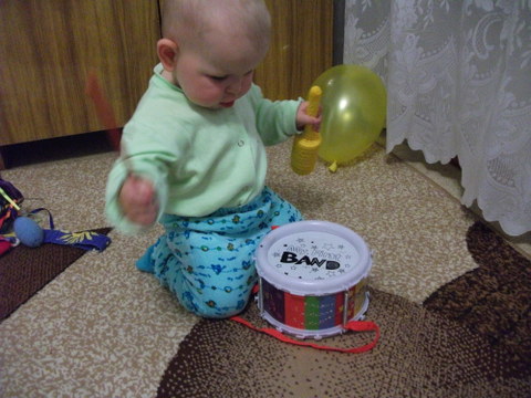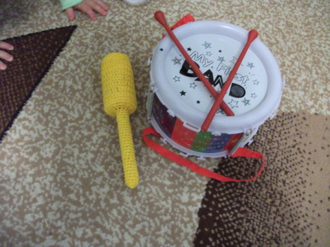 2. А после обеденного сна роднульку ждал сюрприз в виде одного маракасика )))) Это в пару к барабану. Связала по-быстрому, пока малыш спал. В планах связать второй. Очень весело пошумели и постучали, понравилось ))))