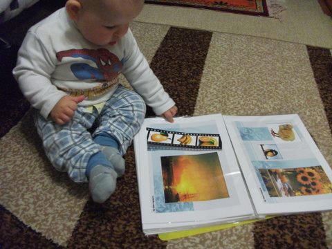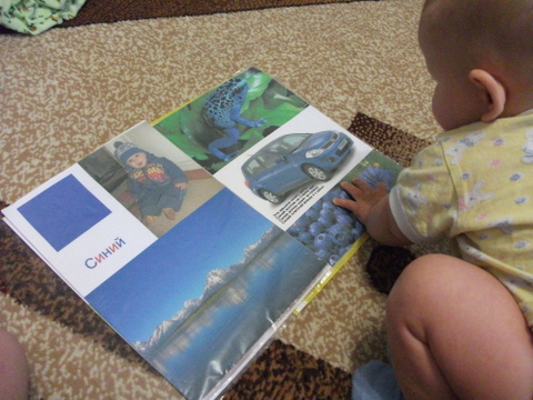 5. Как и запланировали, продолжаем делать цветные странички. Синий разворот получился также интересным, как и красный. Главное, там есть машина (очень мы их уважаем)))). А также по вашему совету, вставили туда фотографию сына в синем костюмчике. Пока не поняла, узнает ли он себя, но смотрит с интересом )))