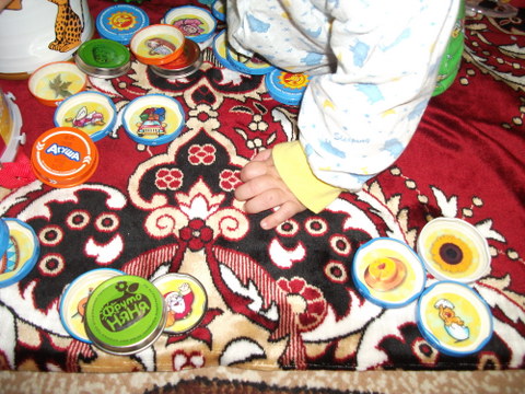 3. Уже вечером посмотрели картинки от лото и выбрали из них желтого цвета, оказалась только одна конфетка. Поэтому пошли к любимым крышечкам и поискали желтые картинки там, нашли целых три штучки ))