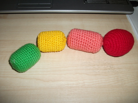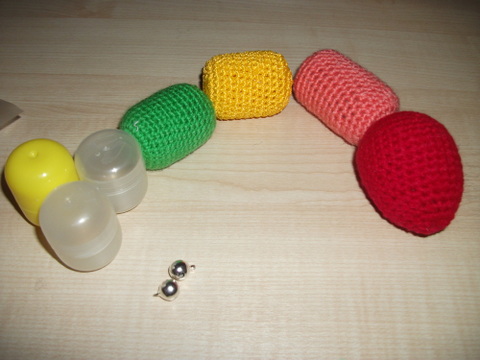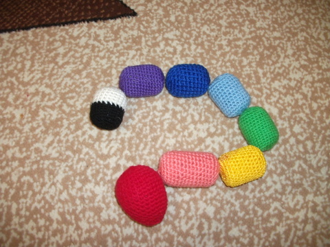 Сегодня закончила вязать зеленую часть нашей будущей гусенички-радуги. Гусеничка состоит из яиц от киндер-сюрприза, в которые я положила разные гремелки по паре, а одна часть просто пустая. С такой гусеничкой можно будет изучать цвета и учиться различать звуки
