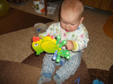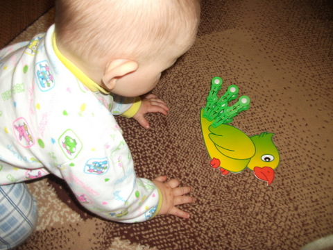 Играли с зеленым попугайчиком и прищепками. Одевать прищепки пока не умеем, зато очень ловко снимаем )))