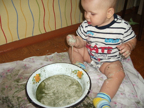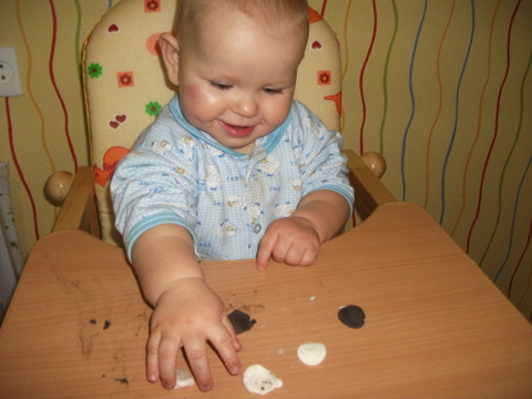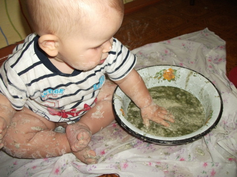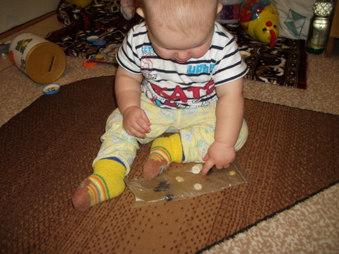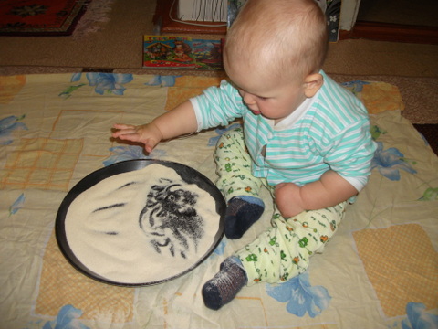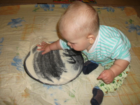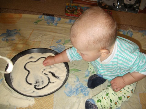 3. Рисование манкой. Это занятие нам уже знакомо и мы с удовольствием возимся в крупе. Конечно до рисования нам далеко, но сегодня сыночка даже немного дал своей ручкой поуправлять и мы нарисовали облако и дождик )))